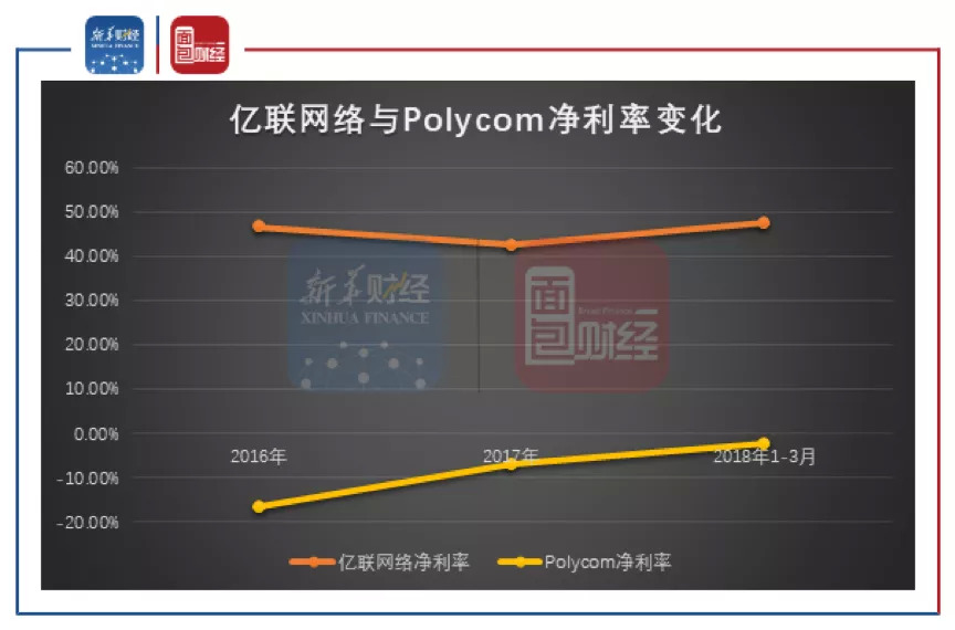 根据公告,2016年、2017年及2018年1-3月,Polycom毛利率分别为55.3%、56.6%和58.46%,净利率分别为-16.54%、-7%及-2.23%。对应期间,亿联网络毛利率分别为63.13%、62.08%和60.98%,净利率分别为46.8%、42.57%和47.61%。Polycom毛利率略低于亿联网络,差异较小,但净利率却大幅低于亿联网络。