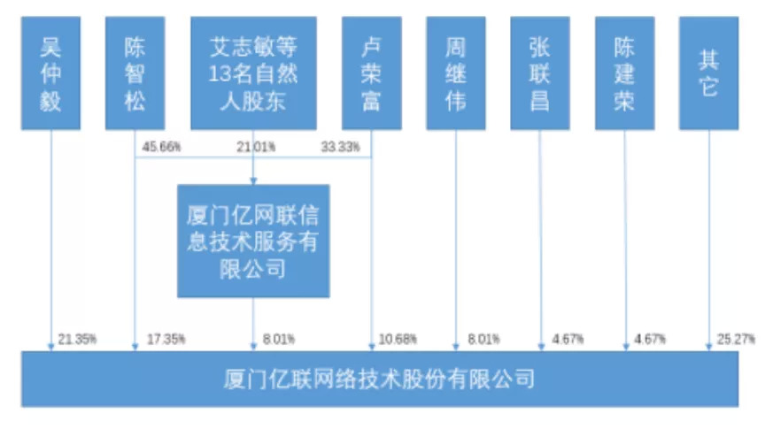截至2019年底,公司实控人自身及通过厦门亿网联控制公司65.4%的股份。另外,实控人之一陈智松的兄弟陈建荣持股4.67%。