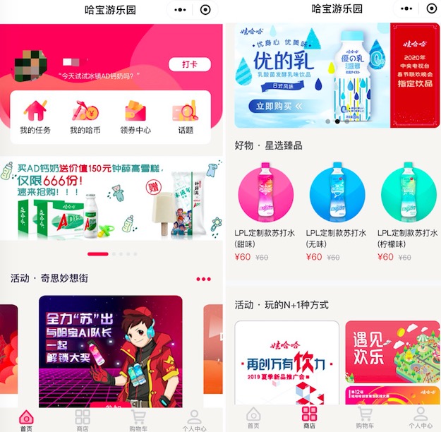 不过这种抢购类活动的目的往往是开通一个流量入口,为哈宝游乐园带来更多流量。在这个小程序中,还能看到娃哈哈2020年主打的新品,包括黑糖奶茶、藜麦牛奶粥、苏打水等。