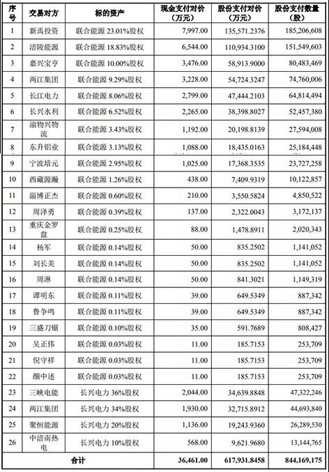 根据方案,三峡水利准备向长江电力、新禹投资等21名对象,收购他们手中持有的重庆长电联合能源有限责任公司(联合能源)88.41%的股份,同时,向三峡电能、重庆两江新区开发投资集团等收购其持有的重庆两江长兴电力有限公司(长兴电力)100%的股权。