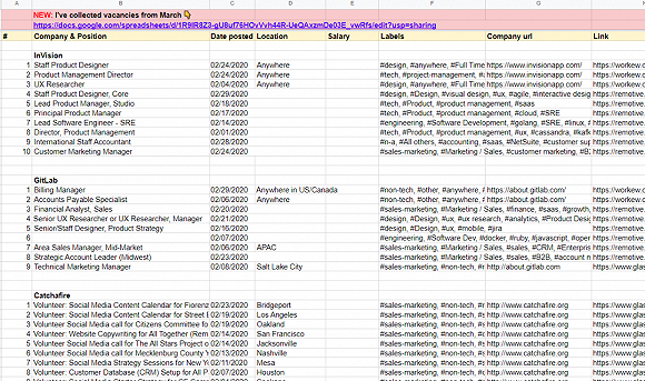 她在Twitter上面发起开源求职表格,表格包括100家企业超过1500份支持远程工作的岗位,为失业的人群提供信息支持。