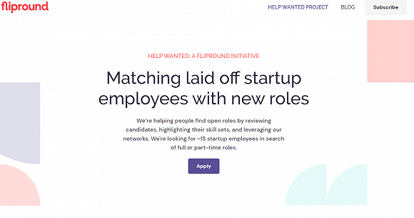 Splash发起了技术与创业互助社区, 为失业技术人员和面临困境的初创公司提供平台和帮助,咨询公司Filp也发起了“Help Wanted”帮助项目, 通过平台审查候选人,突出他们的技能并利用人脉网络来帮助人们找到空缺的技术职位。