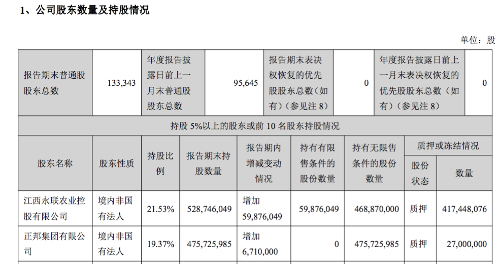 股权质押的情况来看,截至2019年年末,第一大股东江西永联农业控股有限公司持股5.29亿股,持股比例21.53%,质押4.18亿股,质押比例78.95%;第二大股东正邦集团有限公司持股4.76亿股,持股比例19.37%,质押2700万股,质押比例5.68%。