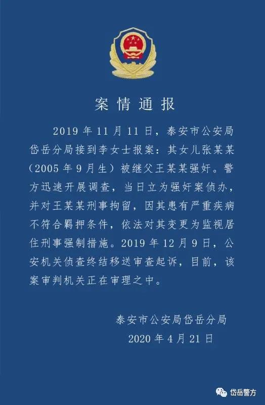 山东省泰安市公安局岱岳分局微信公号“岱岳警方”4月21日发布警情通报:2019年11月11日,泰安市公安局岱岳分局接到李女士报案:某女儿张某某(2015年9月生)被继父王某某强奸。警方迅速开展调查,当日立为强奸案侦办,并未王某某刑事拘留,因其患有严重疾病不符合挤压条件,依法对其变更为监视居住刑事强制措施。2019年12月9日,公安机关侦查终结移送审查起诉,目前,该案审判机关正在审理之中。