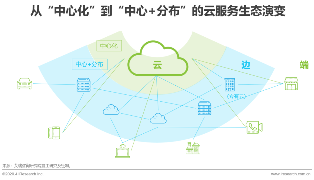 传统意义上,云服务厂商往往使用超大规模数据中心作为中心枢纽,汇聚所有数据;数据来往于“云中心”与端侧星罗棋布的设备。但过于中心化的云基础设施造成了大量带宽资源损耗,造成不必要的网络时延。基础云厂商、CDN厂商以及电信运营商开始部署更多近场设施作为边缘节点,分散“中心”的过大压力,实现与端侧的更快交互。当前,随着边缘计算日益兴起,边缘侧节点逐渐完备,专有云亦成为“中心+分布”式云生态中靠近端侧的分布云的重要实现形式。