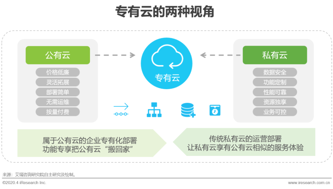 当前,专有云的概念并未形成统一定论。从云服务所涉及的基础硬件所有者、运维管理方,以及计算资源的所属权来考虑,艾瑞认为,专有云是由第三方云服务厂商提供IT基础设施硬件资源和运维管理服务的,并从物理层面隔离出专属虚拟化资源池,所有计算资源仅供所服务的企业独享的一种云服务。专有云从形式上看更类似公有云,但兼具私有云的部分特征。