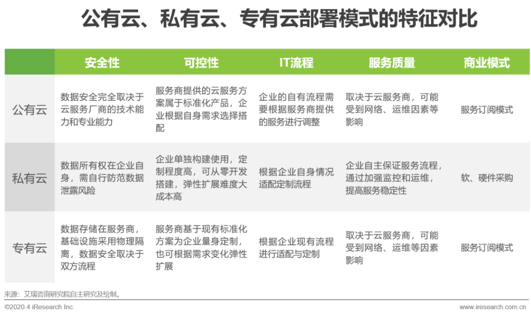 不同的云服务厂商在基于自身既有优势的云服务业务模式下,往往对“专有云”有不同视角的理解。公有云厂商的专有云,大多是通过将自身公有云技术,按照企业所需规模需求进行轻量化部署,让客户将公有云“搬回家”,代表产品包括阿里云的ApsaraStack、金山云的KDC。而私有云厂商大多是基于OpenStack等开源框架二次开发后部署的专有云,此类专有云具有很强的定制性,为客户提供专业一体化的云解决方案和云化部署,代表产品包括华云、有孚云等。艾瑞认为,从本质上来看,专有云是公有云的专属部署模式,集中了公有云和私有云的优势,从而更好地适配企业对云计算的需求。