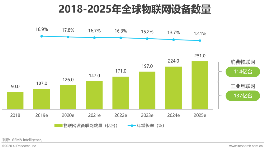 根据GSMA智库的预测,2025年全球物联网设备(包括蜂窝及非蜂窝)数量将达到251亿台,是2018年90亿台的约2.8倍。其中,工业互联网设备数量将反超消费物联网设备,由2018年的37亿台增长至2025年的137亿台。5G时代的到来将加速 万物互联的推进,在政策的推动作用下,大规模、高并发的物联网场景及这些企业对数据安全性的考虑,让工业互联网成为专有云新的增长点。