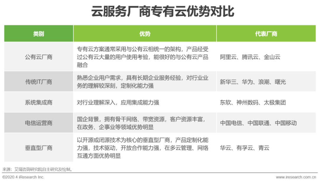 以中国电信、华为云为主的厂商,一直于政企客户保持合作,积累的客户资源是其最大优势。阿里云、腾讯云为主的头部厂商凭借消费互联网中的积累,在向私有云、专有云拓展时也有自身技术优势。以华云、有孚云为主的厂商将进一步提高和输出在特定领域的行业经验,形成特定行业的云计算落地流程和样板案例,也极大促进了专有云、行业云建设的落地。
