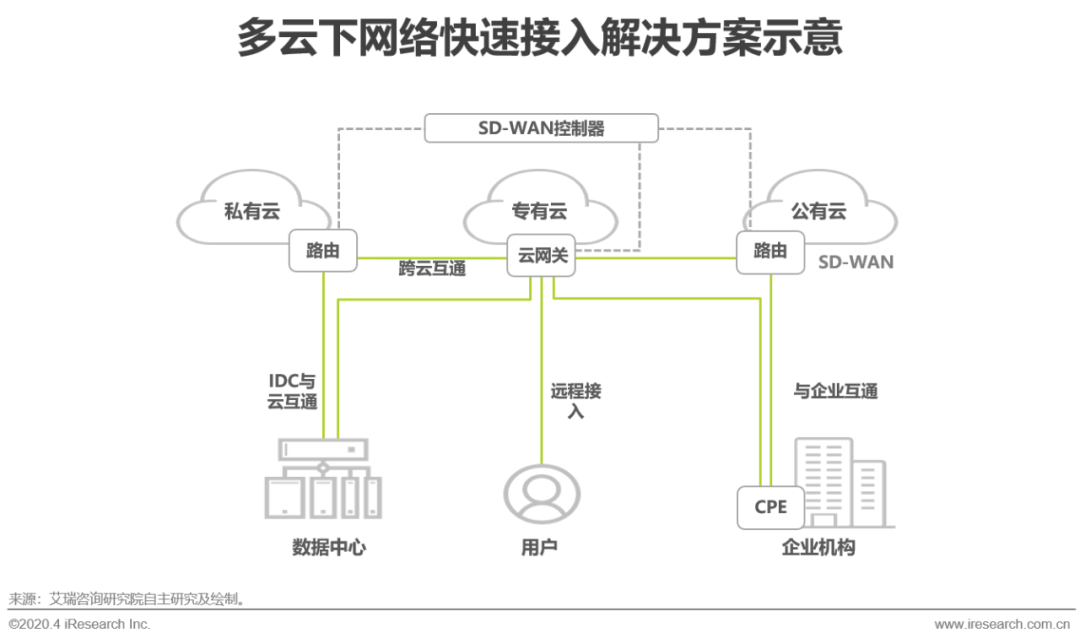 公有云的优势是成本低,企业出于成本考虑将响应时间要求低的业务在公有云上,或是企业应用需要引入公有云的服务,接入PaaS平台等,需要通过云网关将企业IT系统、私有云、专有云、公有云等端连接,从而实现混合云。这种多云混合的模式是专有云服务商未来重点延伸的领域,专有云成为多云融合策略的一部分,以提高云服务能力。将不同形态的云、传统IT系统等进行组合,提高用户跨云的资源利用率,催生出新的业务,更好的为业务服务。混合云也将被越来越多的企业采用,提高系统的可用性,提升应用负载能力,应用开发效率等。同时,基于原有VPN的专线的网络连接方式,云服务提供商正引入SD-WAN组网技术来优化自己的专网,探索云网融合发展,保障企业上云后的多云高质量、高稳定性互联。