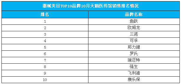 10月,天猫医药馆内6大类目商品占到总份额80%,其中OTC品牌药前三甲表现坚挺,器械类雾化器成黑马。在TOP10店铺中,第一名康爱多的优势进一步拉大,月度销售额破4000万。