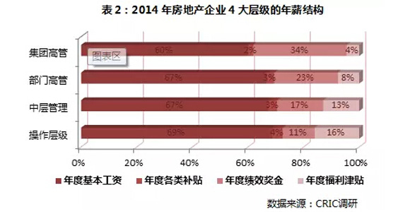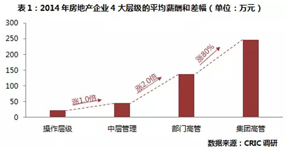 从报告中可知,2014年国内房企从具体操作层到集团高管4大层级的平均薪资为23万元、45万元、137万元、247万元,差距较上一年均进一步拉大。