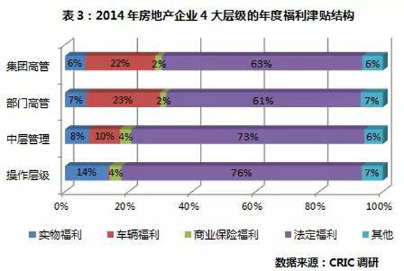 从福利津贴结构看,包括“五险一金”的法定福利占比最高,尤其是中层管理以下员工,占比接近8成;车辆福利是高管级别福利津贴的重要组成部分,占比保持在22%上下。