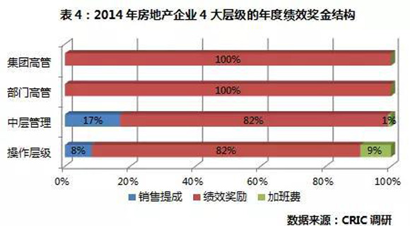 总而言之,与2013年相比,中国房企四大层级薪酬结构普遍出现重要变化,业绩增幅进一步收缩,乃至出现负值,直接带动绩效奖金低于预期水平,从而引发绩效奖金比重的全面缩减。