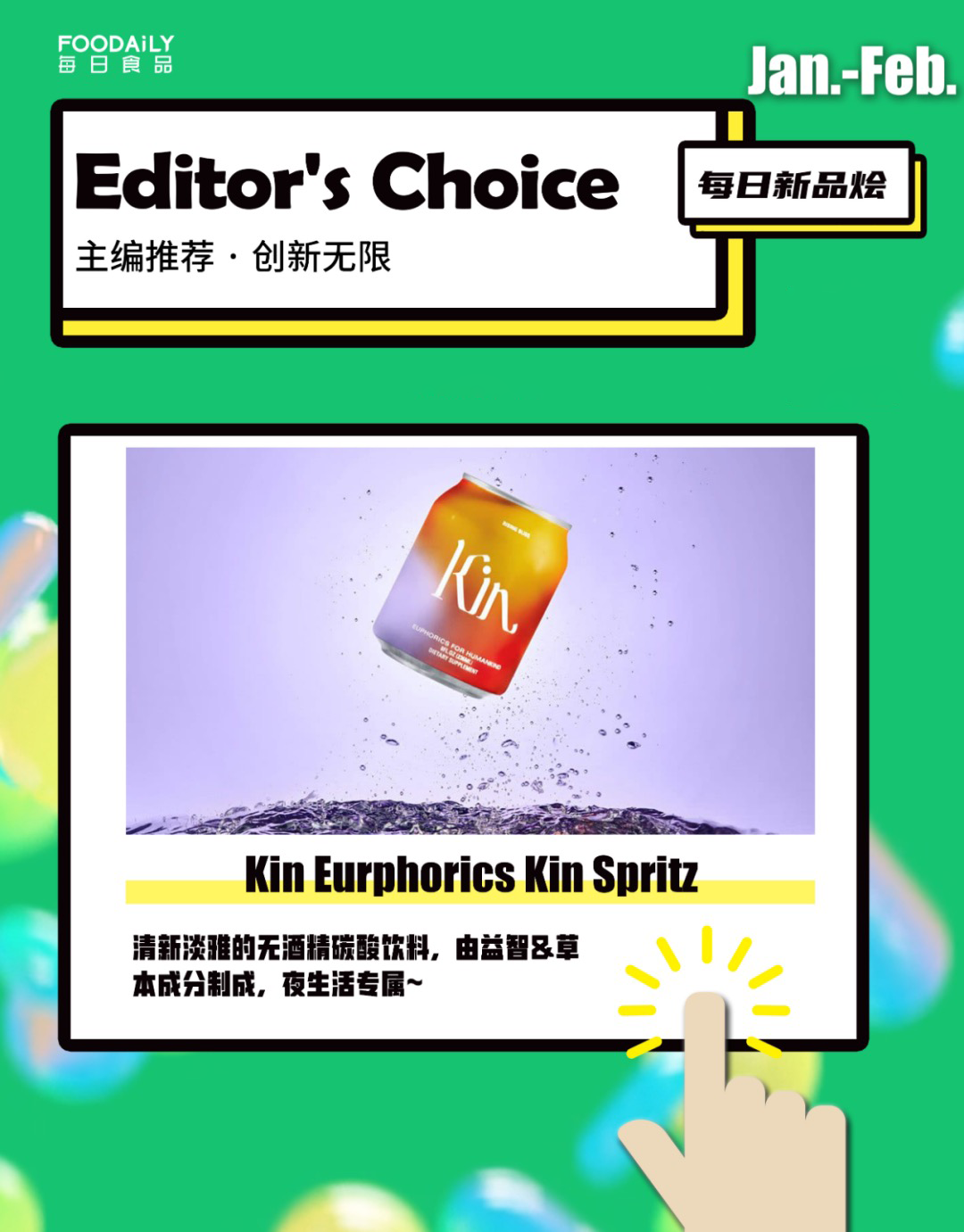 非酒精成人饮料品牌Kin Eurphorics推出的一款软饮料Kin Spritz,一款可以在社交时间开怀畅饮的无酒精草本功能饮料,成为Foodaily“每日新品烩”1-2月Editors' Choice。