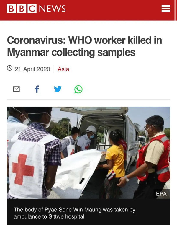 就此事件,世卫组织21日在其官网上也发表了一份声明,声明提到世卫组织对其在缅甸的工作人员的死亡表示哀悼,并谴责将参与应对新冠肺炎疫情的卫生工作者作为目标的行为。这份声明还提到,这名司机是在20日晚间受伤后不治,当时他正从若开邦开车前往仰光。