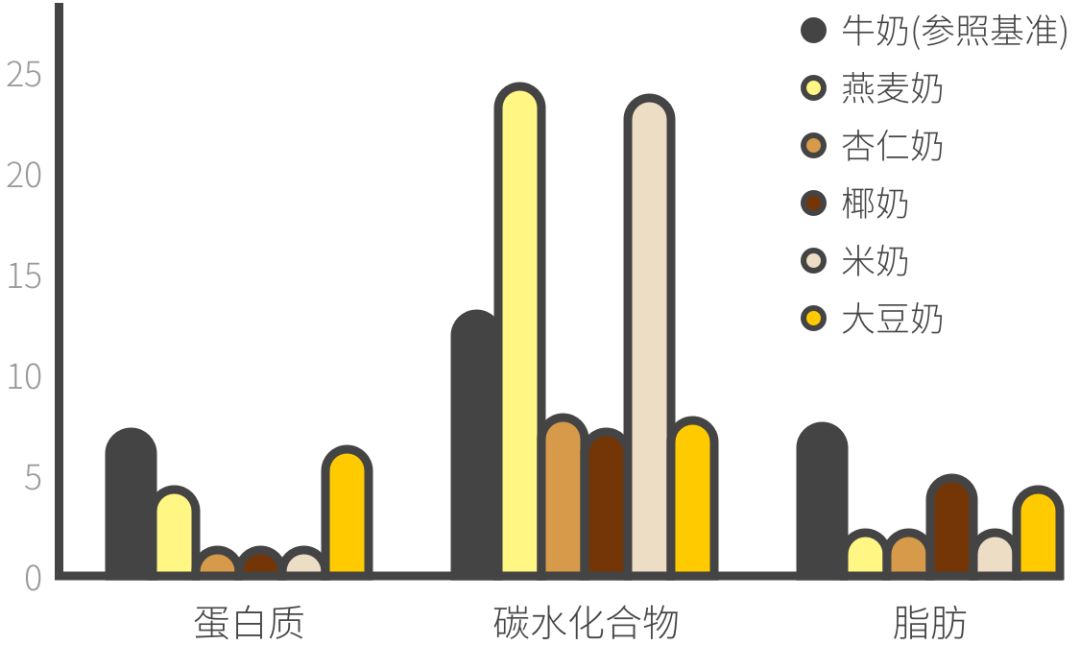 牛奶所含的蛋白质、脂肪、碳水化合物配比十分平衡;而植物奶中,除了大豆奶,蛋白质含量都比较低。