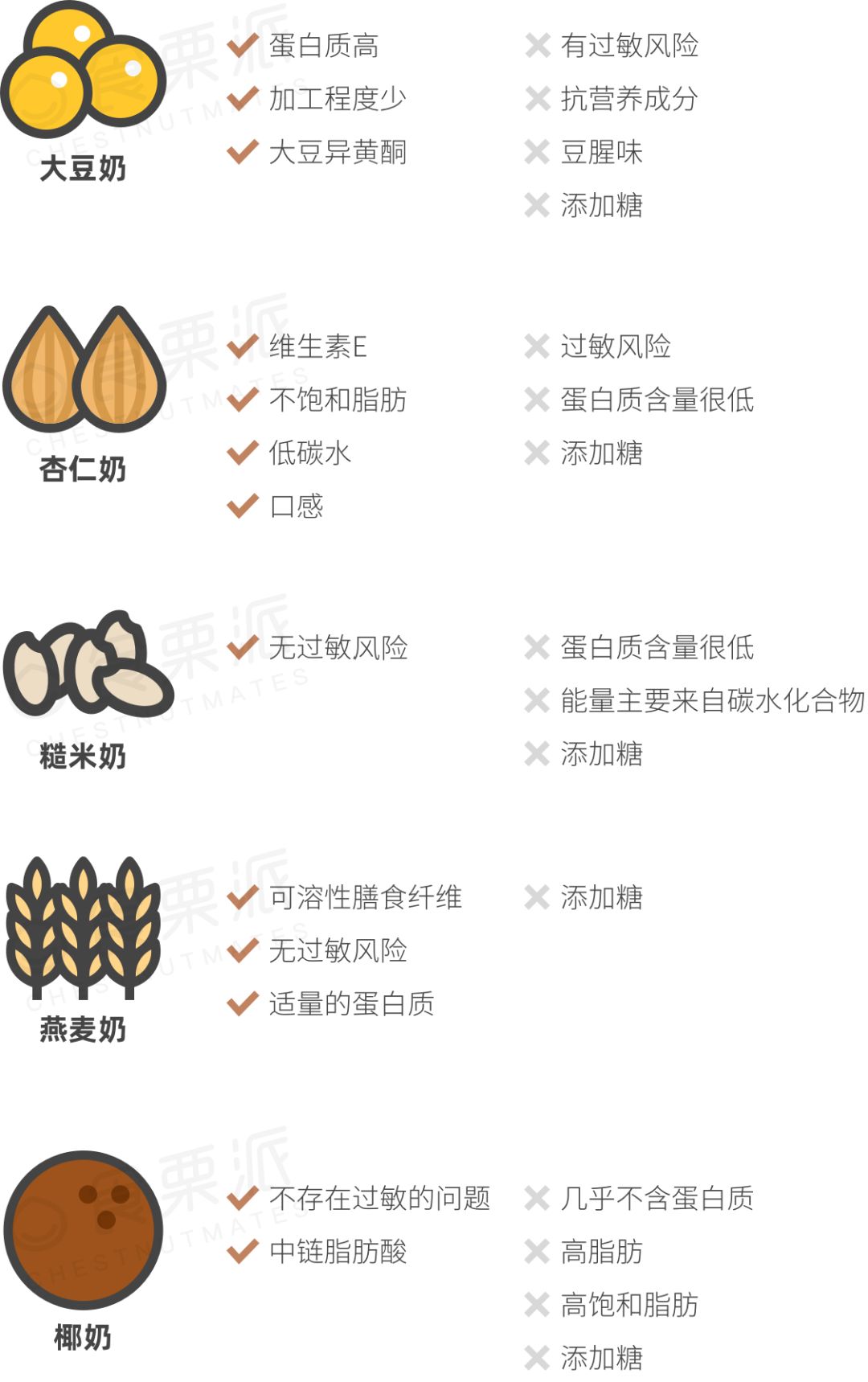 其实我觉得,牛奶跟植物奶本来就是两类食物:一个是乳制品,另一个不如看成是大豆、坚果、谷物制品,它们的营养价值是不同的,不能互相替代。