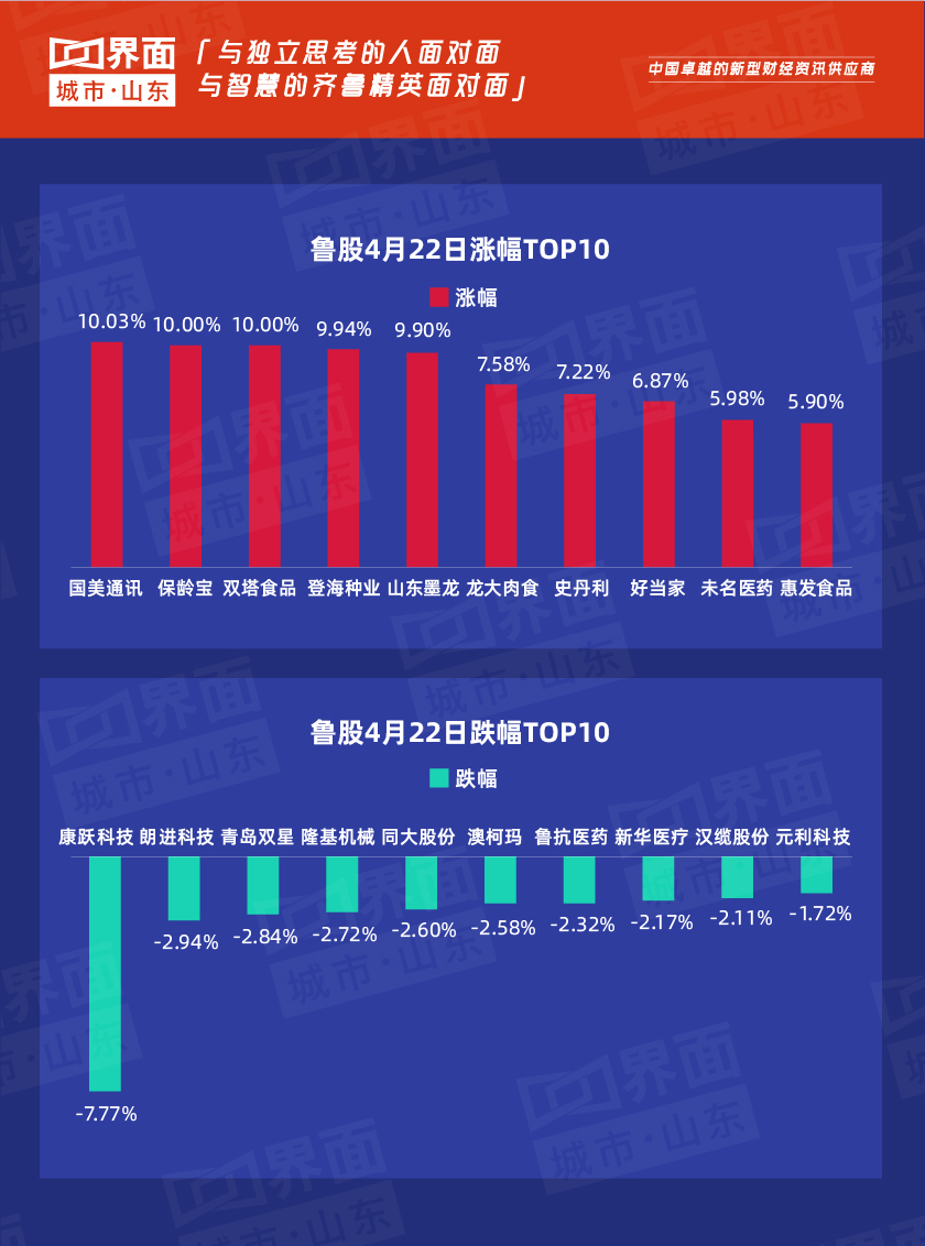 4月22日,山东省内沪深股票有133只个股上涨,69只下跌,8只与上一个交易日收盘价持平。国美通讯(600898)涨幅达10.03%为全省最高,康跃科技(300391)涨幅-7.77%全省最低。