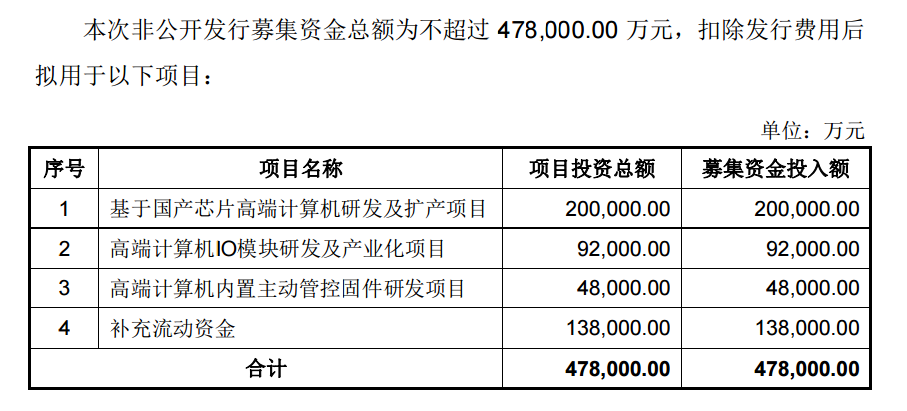 4月22日晚间,中科曙光(603019.SH)公告拟非公开发行募集资金不超过47.8亿元,扣除发行费用后用于基于国产芯片高端计算机研发及扩产项目、高端计算机IO模块研发及产业化项目、高端计算机内置主动管控固件研发项目以及补充流动资金。