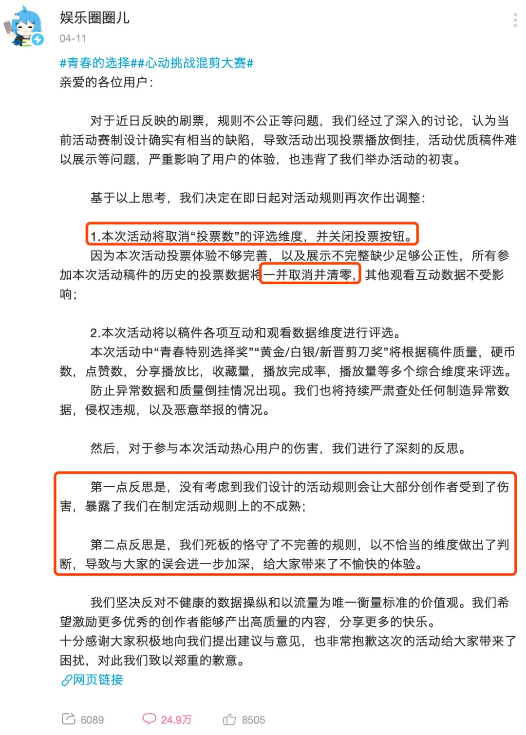 B站方面也很快发现了活动中存在的问题,并前后两次发出了公告,先是承认该活动“的确存在评选纬度单一的问题”,之后又宣布该活动“历史投票数据将一并清零”、“将以稿件各项互动和观看数据为度进行评选”。