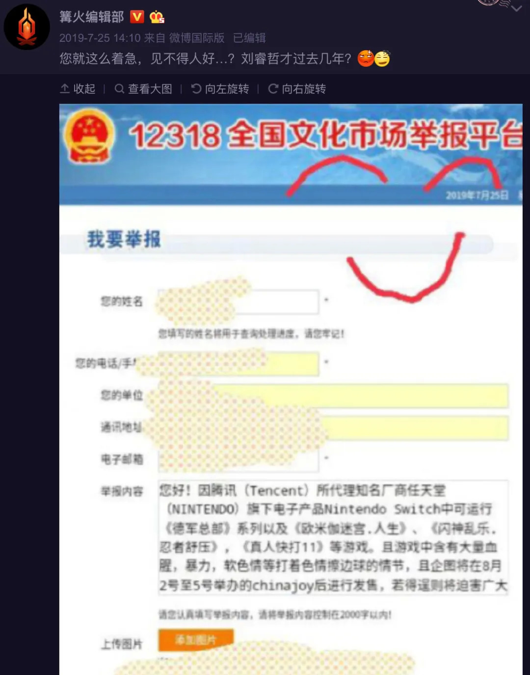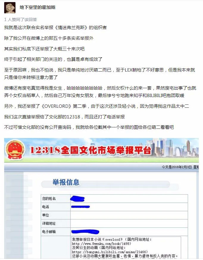 引发这一系列事件的主要原因,是一位激进动漫爱好者的举报所致。在公开承认自己的举报行为后,他先是在知乎上说自己这么做主要是单纯讨厌所谓的“萌二”,认为动漫作品不能那么媚宅,后又表示自己是“某985高校社会学系博研”,所有发生的事件,都是早已策划好的社会学课题研究……