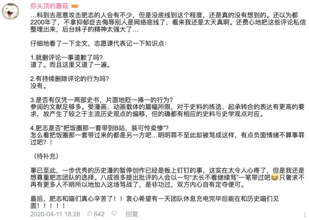 就在上个月,国产动画《如果历史是一群喵》的作者肥志发出公告,宣布该动画将在本季完结后停更。这起停更事件的起因,是该动画在讲述三国故事的时候,被部分观众认为有“捧曹操,踩刘备”的嫌疑,最终演变成“作者对历史的研究认知水平不行”、“作者是曹操粉,在动画里加私货”、“作者丑化历史人物”等一系列的口诛笔伐。