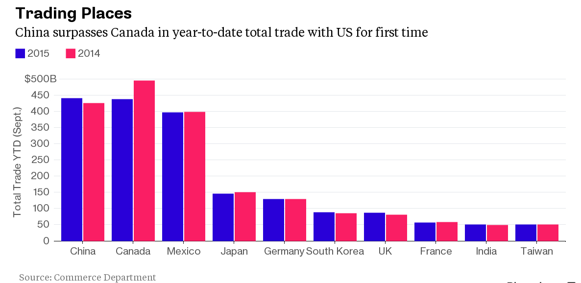 中国已超过加拿大成为美国最大的贸易伙伴。据彭博社5日报道,这得益于油价下跌降低加拿大对美国的能源出口总值。