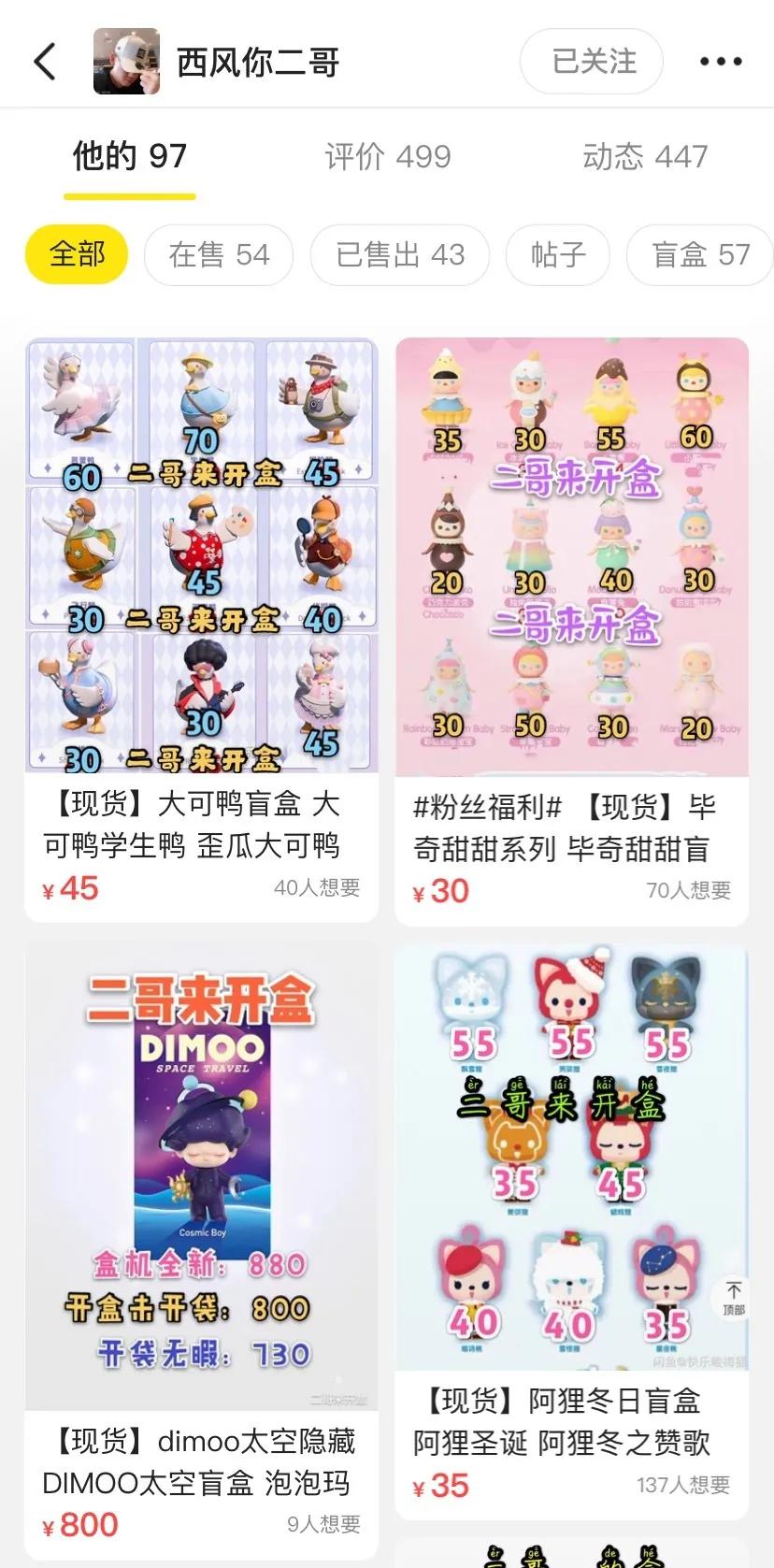 “二哥”光是在闲鱼出售自己的闲置盲盒,就卖了将近二十万。他还在两个月时间内,帮其他“娃友”在闲鱼卖出了上千个娃娃。对一部分狂热玩家而言,二哥成为了他们降低开盒成本的“后勤保障“。