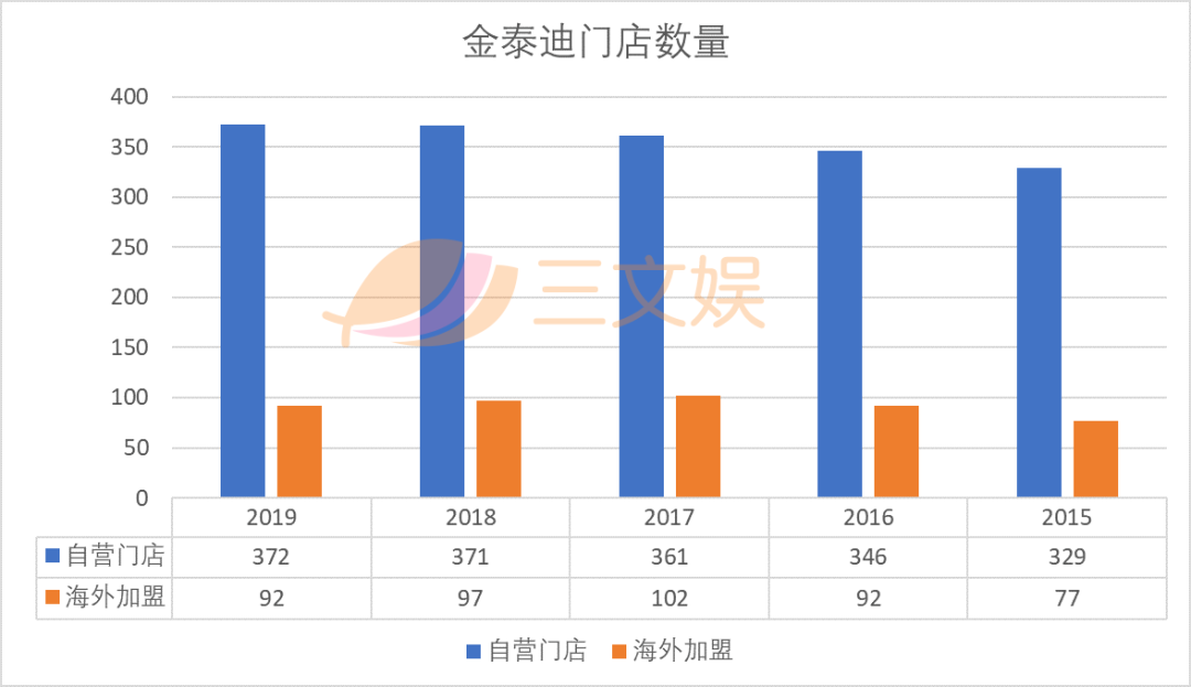 最近这几年,金泰迪的自营门店数量处于一个慢慢增长的状态,每年都会关闭一部分门店,同时开设更多门店。2019年金泰迪在北美关了13家店,又开了18家店,在欧洲开了1家店又关了5家店。