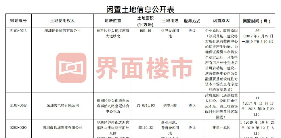 据界面楼谈统计,在深圳规划局最新公开的闲置土地信息汇总表中,共有58宗土地开发停滞,土地用途多样,其中土地面积最小的为981.19平方米,最多的则达20多万平方米,闲置多为企业自身原因。闲置时间短则为1个月,长则多达205个月。