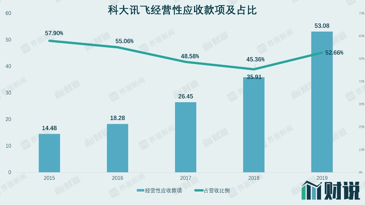 财务数据显示,应收票据和应收账款合计的公司经营性应收款项占比常年保持高位。由于公司相对政府及大型企业而言议价能力较弱,长期以来被客户通过经营性应收款项的形式“砍价”,这一点通过近五年的经营性应收款项的高占比便可看出。2015年至2019年五个财报周期,科大讯飞平均经营性应收款项占营收比高达51.91%。换而言之,公司每1元的营收对应超过一半的“账款”。