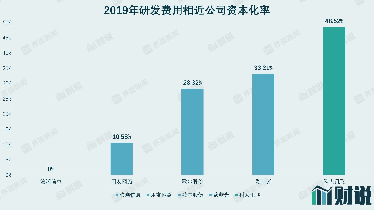 研发费用最后归结的科目有两个,一个是无形资产,即研发资本化,该会计手法不影响利润但使总资产增加;另一个是研发费用化,会影响利润但可以减少税收。一般来说,科技企业的研发资本化率在30%以内。界面新闻选取研发费用和科大讯飞相近的几家公司作为对比发现,科大讯飞费用资本化率远高于其他企业。