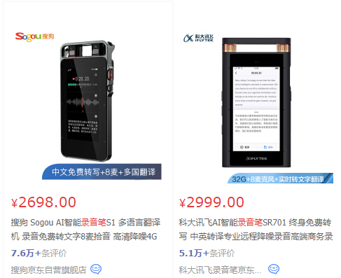 2020年2月搜狗正式发布其录音笔产品S1,目前已对科大讯飞构成威胁。以京东商城为例,科大讯飞销售的SR701旗舰版录音笔在销量、评价数量上都落后于新对手搜狗S1,仅在价格上具有“领先”优势。作为深谙智能语音市场多年的AI公司,其旗舰品牌在面对仅2个月的新对手便呈现出相对弱势,产品核心竞争力可见一斑。