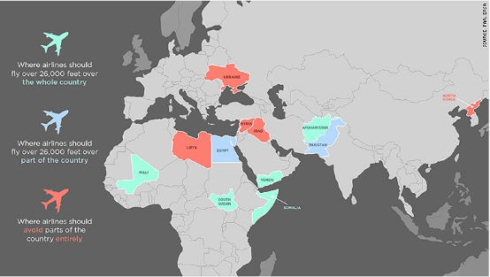 归纳起来看,CNN的这张图可以告诉你,哪些地区在飞行途中是需要完全避开的,哪些地区是有飞行高度限制的。