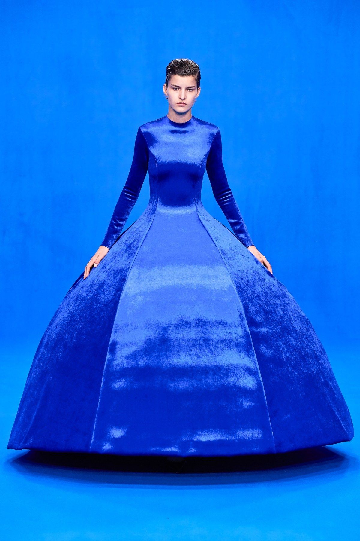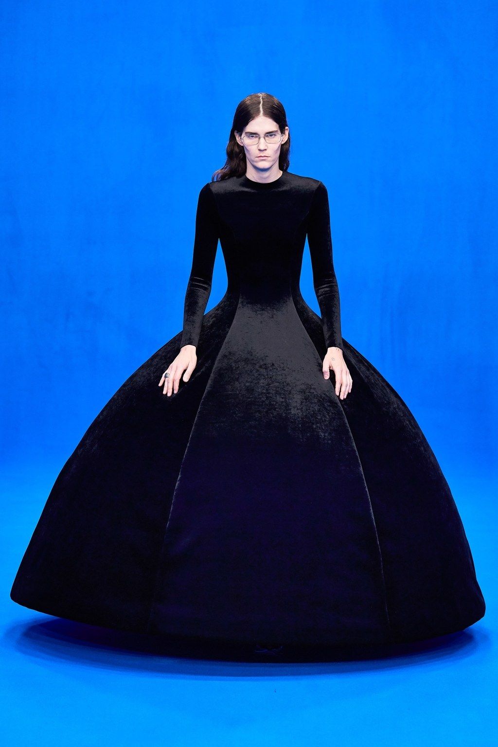 天鹅绒作为制作礼服的主要面料,以柔软而华贵的质感和光泽来回应舞会主题,其在巨大裙摆上的延绵让人联想到以往那些遍布着社会名流的沙龙舞会。但对于Demma Gvasalia来说,原汁原味地复古永远不会出现在他的创意中。硬朗的垫肩、紧密包裹身体的上半身形象刻画出了一个紧皱没有的严肃修女形象,而以及冷峻却又滑稽的弧型裙撑支架则十分后现代,充满了对传统陈规的嘲讽。