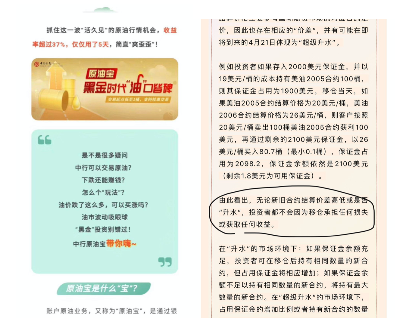 此外据中国银行微银行公众号《原油宝移仓必读》文章显示,移仓影响一栏中提到,无论新旧合约结算价差高低或者是否升水,投资者都不会因为移仓承担任何损失或获取任何收益,都引发了中行风险披露不当的质疑。