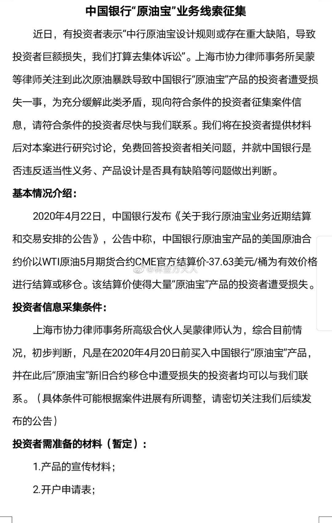 前所未有的巨额赔付下,投资者问责中行声起。据界面新闻获悉,亏损投资者已在社交平台自发组织多个维权群,最大的微博维权群人数已达4000人,已有投资者写好举报信欲向相关部门举报进行维权,也有部分投资者已于线下支行交涉维权;与此同时,多家律师事务所开始征集投资者损失讯息准备发起集体诉讼。