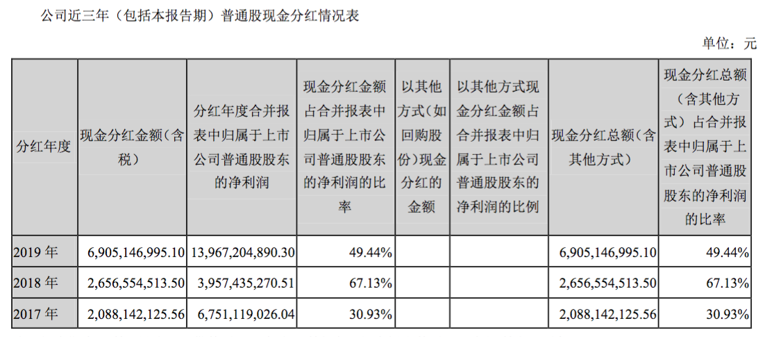 2019年,温氏股份拟向全体股东每10股派发现金10元(含税),合计派发现金53.12亿元,同时进行资本公积转赠股本,向全体股东每10股转赠2股。加上2019年中期派发现金15.94亿元,2019年,温氏股份累计分红69.05亿元。