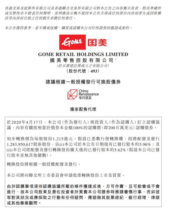 这几天,黄光裕也没闲着。4月19日,拼多多宣布,将认购国美零售发行的2亿美元可转债,如最终全部行使转换权,拼多多将最多获配12.8亿股国美新股份,约占后者发行转换股份扩大后股本的5.62%。