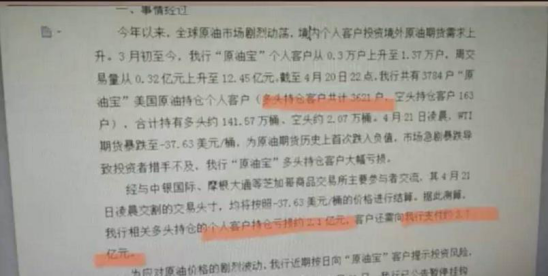 而根据网传的一张关于中行的事件描述图:“境内客户投资原油期货需求上升,3月初至今我行原油宝个人客户从0.3万上升到1.37万户,周交易量从0.32亿元上升到12.45亿。据此测算,我行相关多头持仓的个人客户持仓亏损2.1亿元,客户还需支付3.7亿元。”