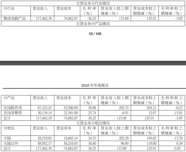 2019年,博通集成各项主营业务呈现毛利率下降趋势。无线数传类、无线音频类产品毛利率分别较同期减少0.23%、13.01%。