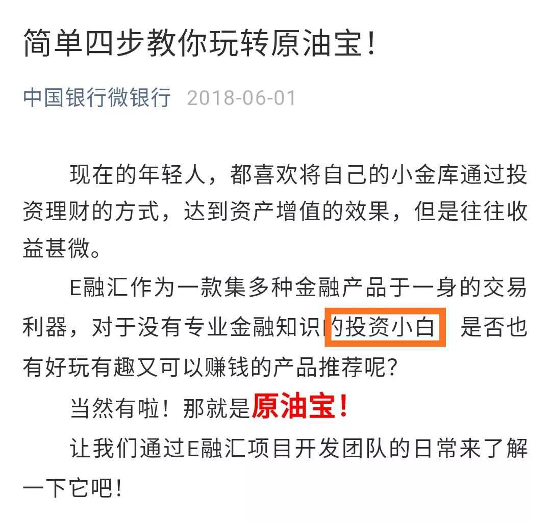 《每日财报》注意到,中行在其公众号“中行微银行”中表示,原油宝是适合没有专业金融知识的投资小白投资的。不少投资者都表示,原油宝本属于不带杠杆的期货,正常情况下最多把本金都亏完了,哪里想得到赔的“兜裆布”都不剩。