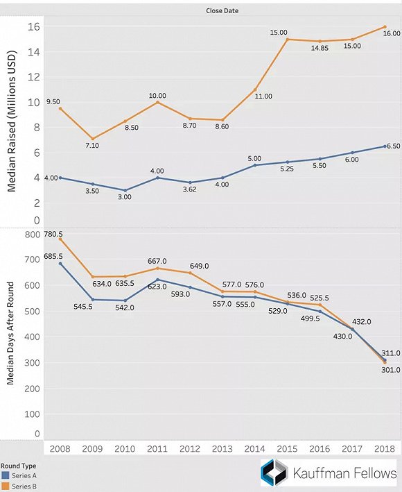 自2008年以来,A轮和B轮的风险投资规模分别增长了68%和62%。与此同时,完成下一轮投资所需的天数也减少了一半。这意味着完成A轮和B轮的初创企业现在的现金消耗量是十年前的3倍。而这些额外的资金,并没有延长初创公司烧光钱的时间。