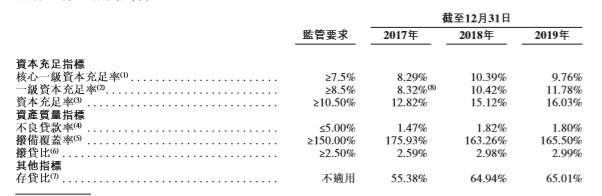 从资本充足指标来看,威海银行2019年资本充足率基本达标,但距离监管红线并不远。招股书显示,威海银行2019年资本充足率、一级资本充足率、核心一级资本充足率分别为16.03%、11.78%、9.76%,较2018年末分别上升0.91个百分点、上升1.36个百分点、下降0.63个百分点。