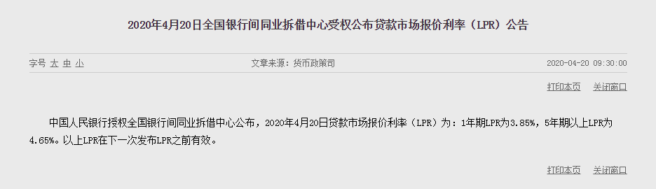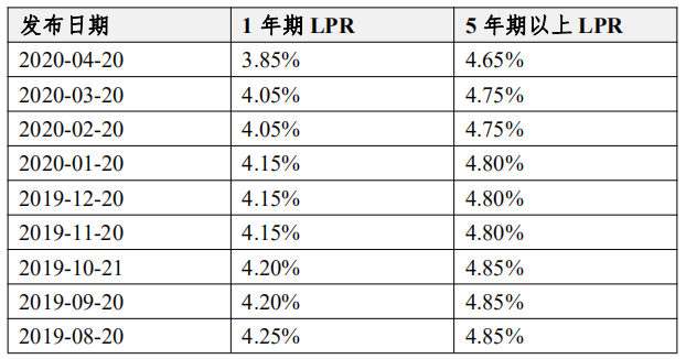 2020年4月20日,全国银行间同业拆借中心公布了最新贷款市场报价利率(LPR),其中1年期LPR由上月的4.05%下调至3.85%,5年期以上LPR由4.75%下调至4.65%。这是年内LPR第二次下降,降幅为去年8月LPR改革以来最大的一次,符合市场预期。