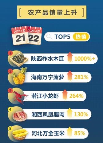 新华网4月22日的数据统计显示,直播带货成为战疫助农的重要手段,农产品销量上升明显。其中,海南万宁菠萝销售量涨幅281%,居全国第二。