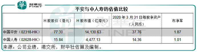 按H股股价以及截至2020年3月31日的每股净资产计,平安的市净率为1.87倍,中国人寿的市净率为1.01倍。