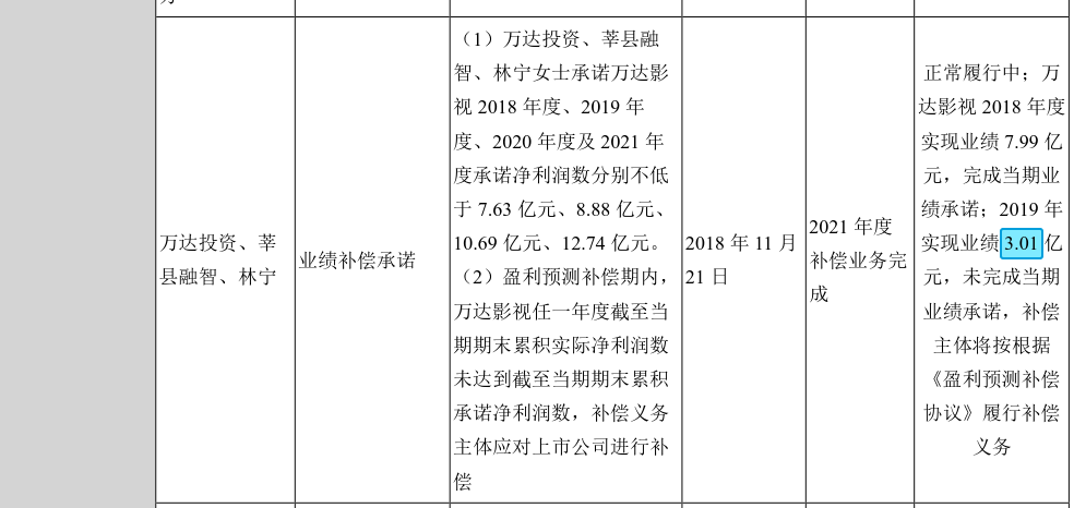 根根据《盈利预测补偿协议》 相关约定,相关补偿义务主体需履行业绩补偿承诺,当期应补偿金额为14.53亿元,当期应补偿股份数量为4375.4万股,该部分补偿将由北京万达投资有限公司(万达投资)全部承担。