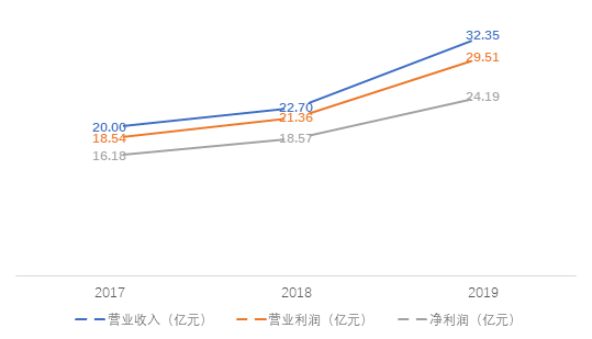 金融行业报表口径下,江苏信托2019年实现营业收入32.35亿元,同比增长42.52%;营业利润29.51亿元,同比增长38.18%;净利润24.19亿元,同比增长30.21%。
